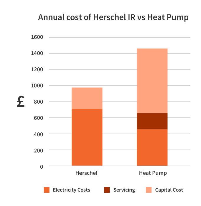 Infrarood biedt een hoog thermisch comfort bij lagere luchttemperaturen. Wanneer de totale eigendomskosten van een warmtepomp ten opzichte van infraroodverwarming worden bekeken over de levensduur van de verwarming (aankoop, installatie, gebruik, onderhoud, vervanging), levert infrarood een zeer aantrekkelijk beeld op.